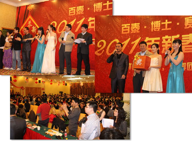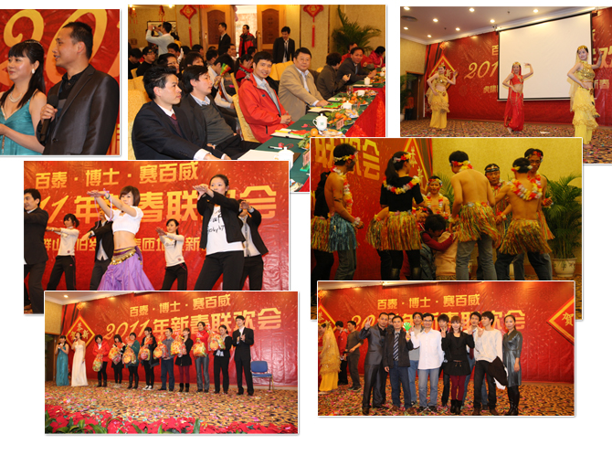 金虎欢歌辞旧岁,玉兔起舞迎新年, 2011年1月15日晚上,公司主题为“百泰•博士•赛百威2011年新春联欢晚会”在增城的百花山庄举行,公司的领导与员工及嘉宾欢聚一堂,共迎新春。